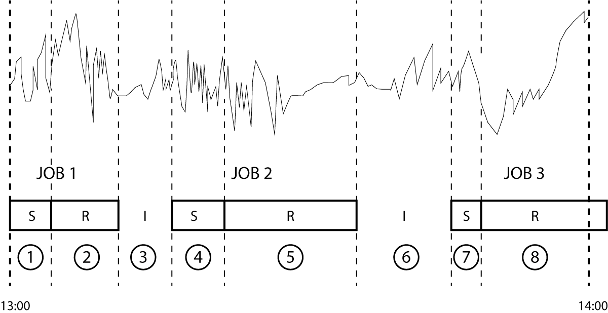 7 summaries: No job & Status IDLE (I): 3 + 6 JOB 1 & S: 1 JOB 1 & R: 2 JOB 2 & S: 4 JOB 2 & R: 5 JOB 3 & S: 7 JOB 3 & R: 8 |