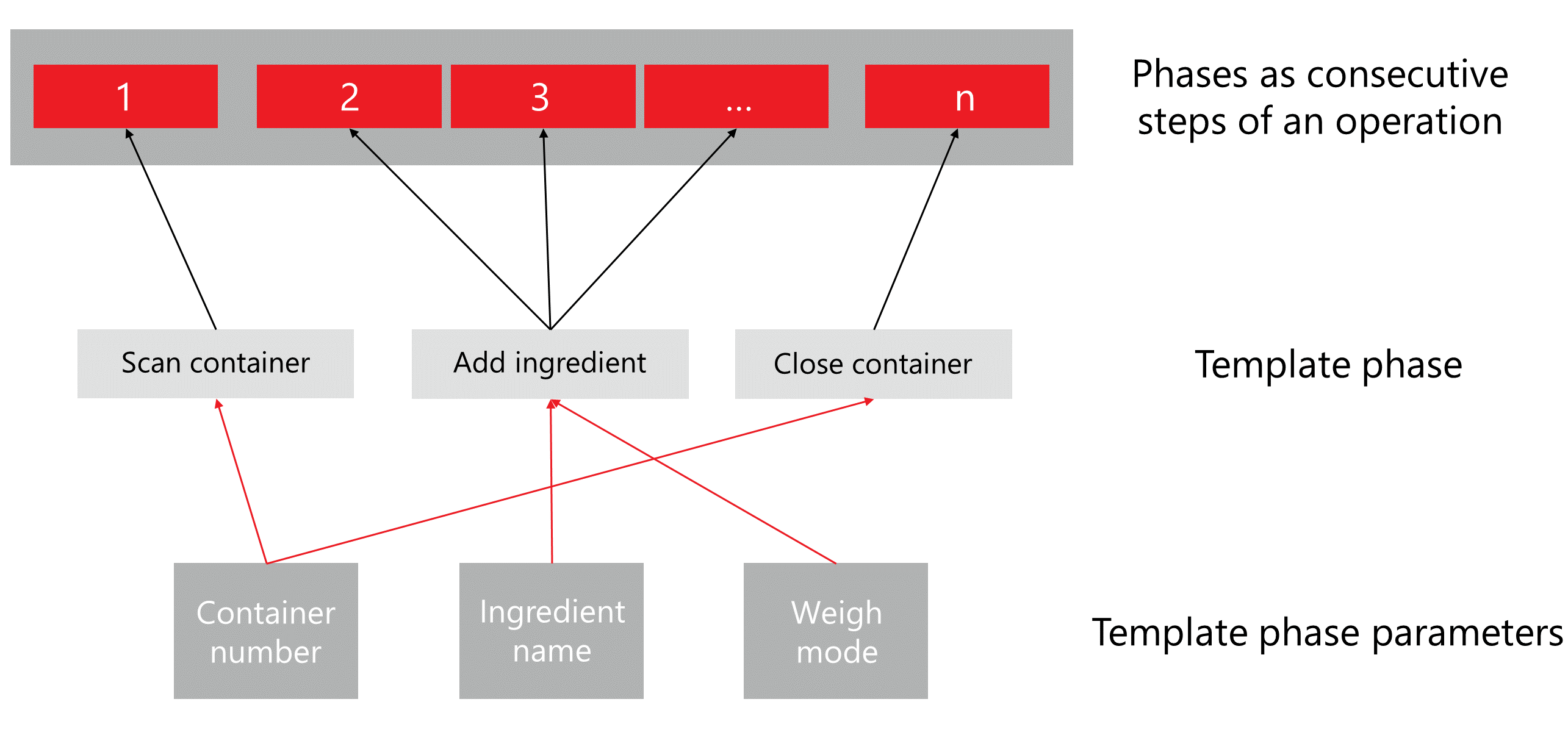 Parameters can be configured via template phase parameters (see Add a template phase parameter). Subsequently, template phases can be created (see Add a template phase) to which these template phase parameters can be added (see Add a phase parameter to a template phase).