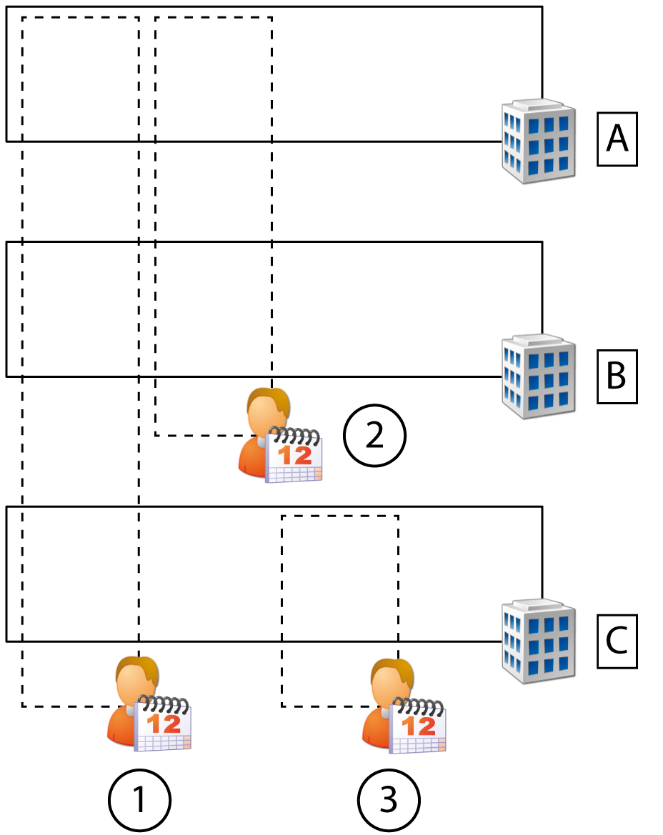 Example: Planning cell (1) consists of all cleaning machines of departments A, B and C. Planning cell (2) consists of all lathes of departments A and B. Planning cell (3) consists of all bottling machines of department C.
