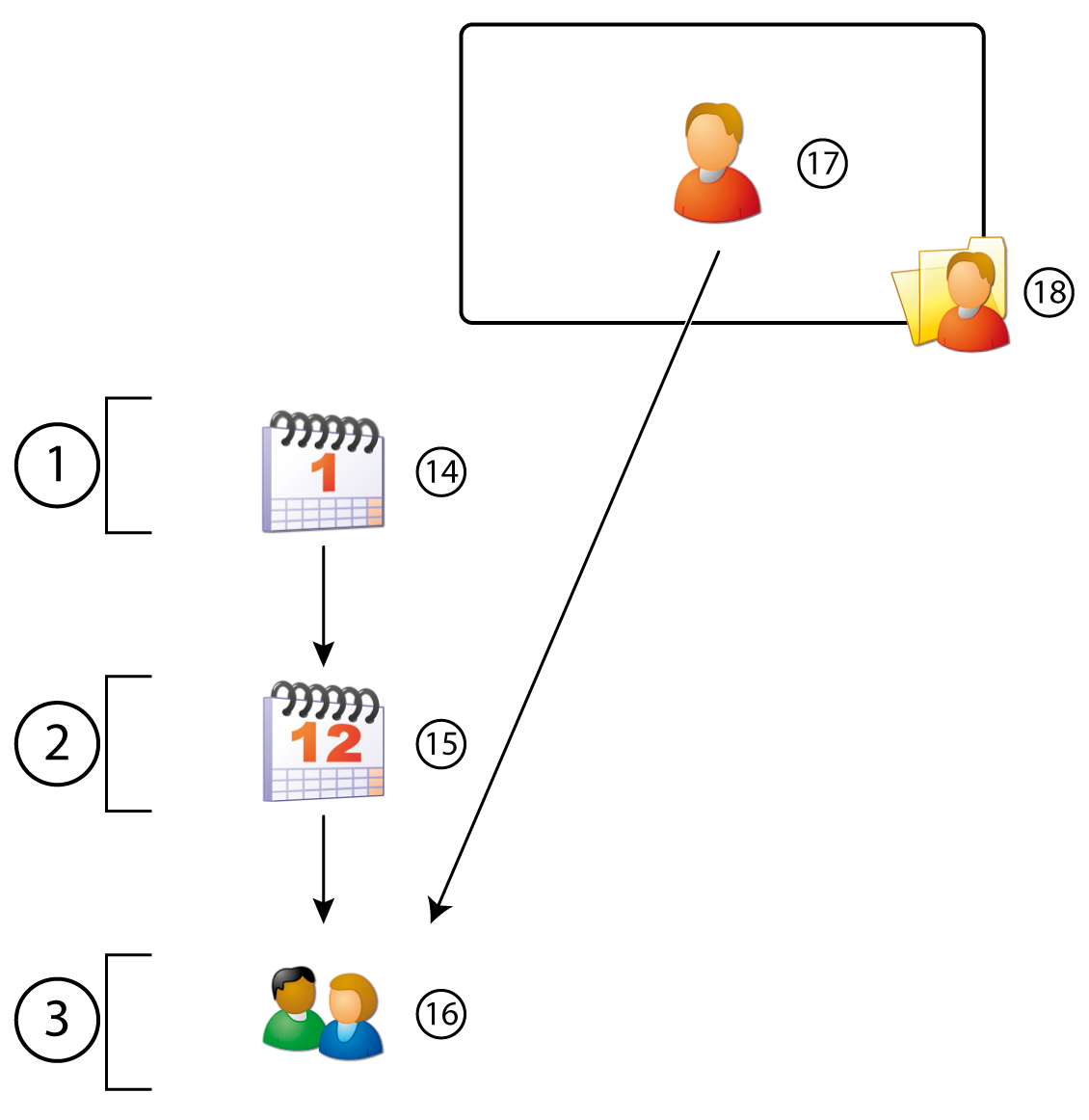 First configure the Days (14) and then the Attendance Patterns (15). Ensure that the Employees (17) are configured and subsequently configure the Attendance Groups (16).