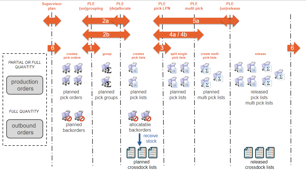 The PLE module manages pickings and crossdocks for production orders and outbound orders, and (grouped) replenishments for pick locations and LPN buffers.