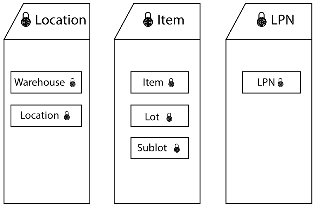 location lock: Warehouse or Location (aisle, rack, shelf, bin)