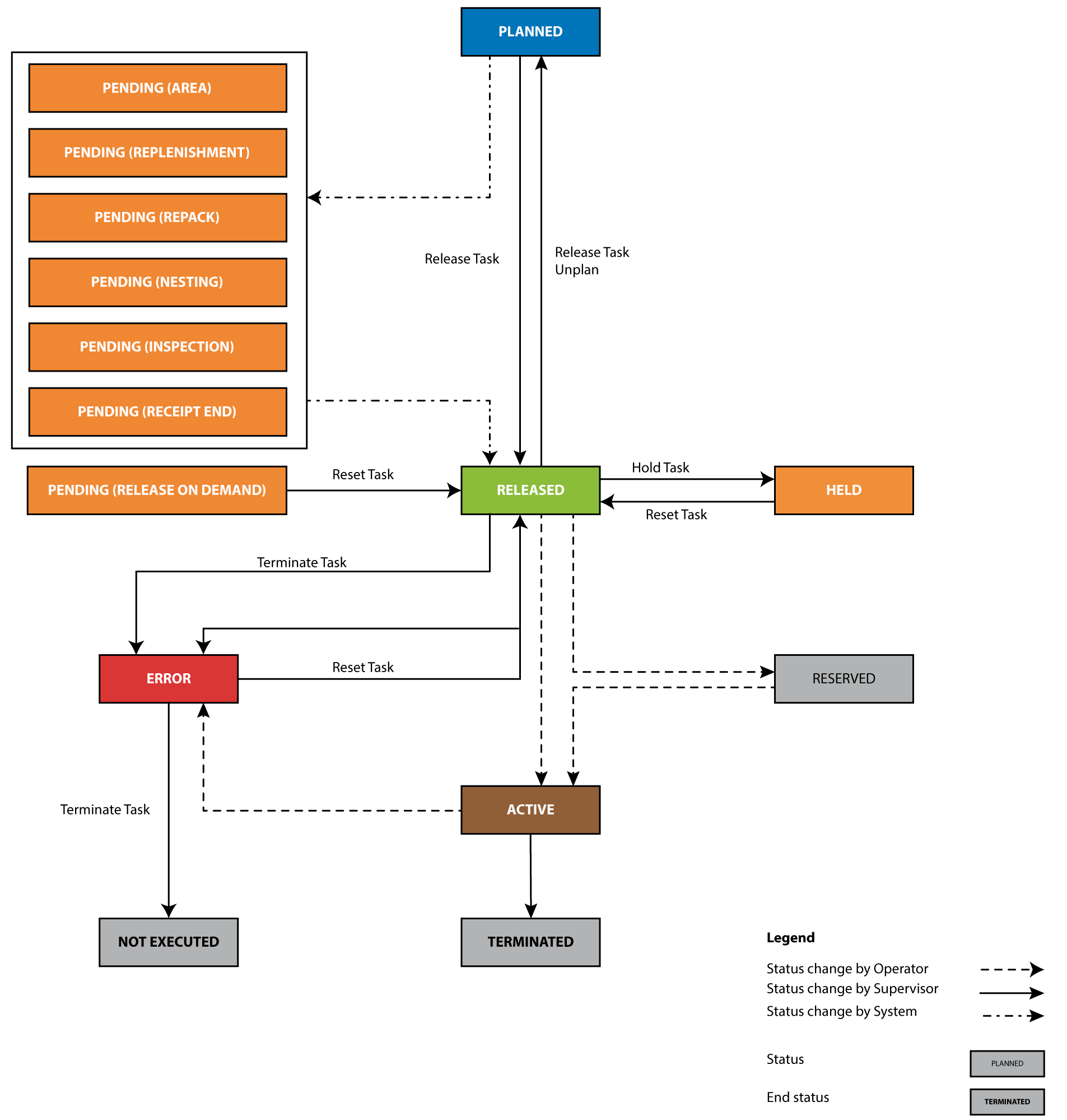 | PENDING | orange | The WMS system keeps the task pending because of the physical limitations on the next target location (for example – staging location full), or because of an inspection task that must be carried out first or because of a receipt that is not yet ended. |