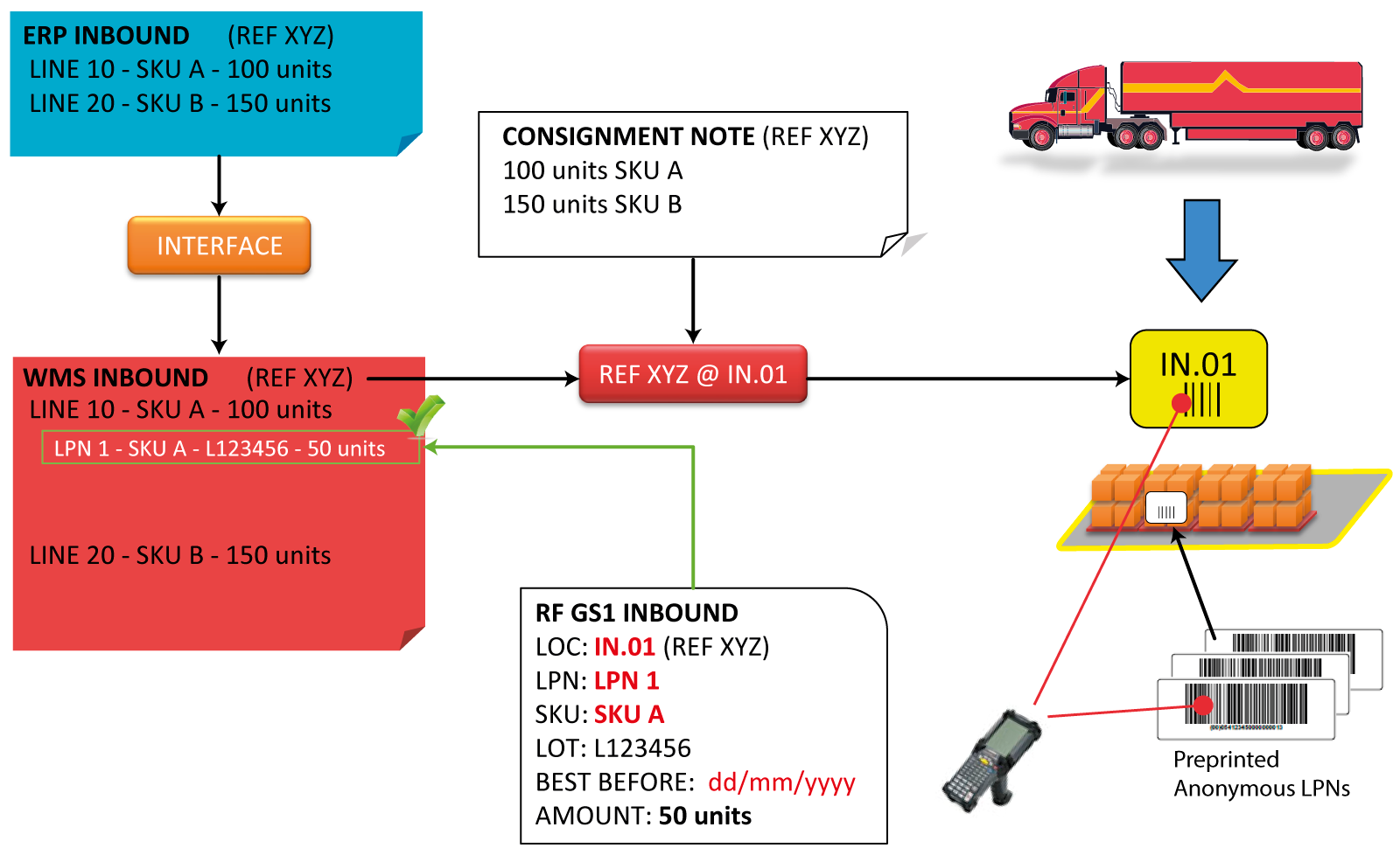 After release of the expected receipt on the PC, the RF device processes the receipt. A unique LPN number is assigned to each received carrier via an operator dialog on the RF device. In practice this can be done by attaching a blank LPN label with an LPN number that has not yet been assigned. Next, the details of the LPN content are registered, after which receipt of the LPN is confirmed.